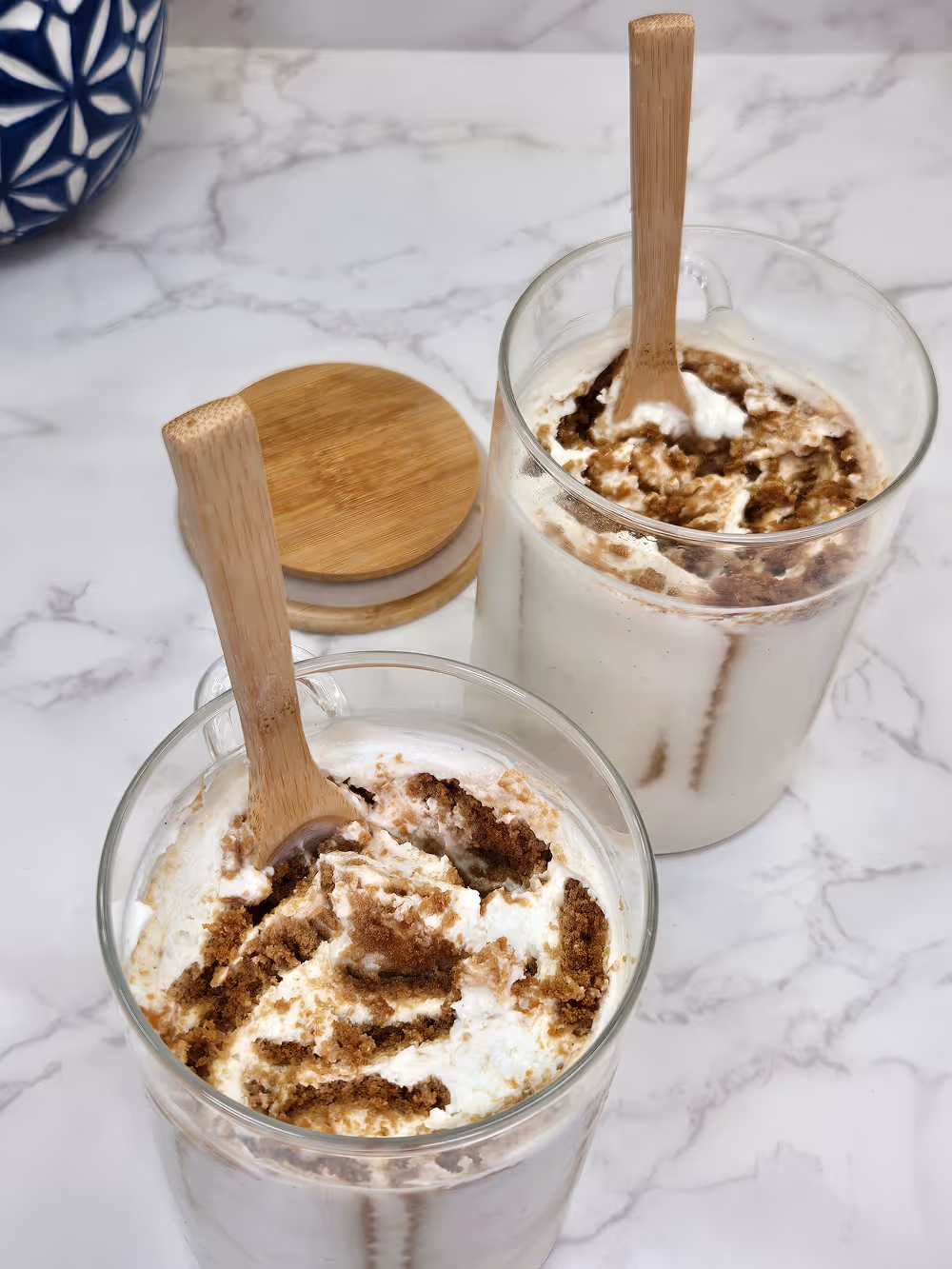 The yogurt base is blended until smooth and creamy with protein powder, a touch of cream cheese, honey, and vanilla. Then comes the viral part: the yogurt goes into a clear jar first, and the biscuits are gently pressed on top so they stay visible. After a couple of hours in the fridge, the biscuits soften into a cake-like texture that feels far more indulgent than it actually is.
